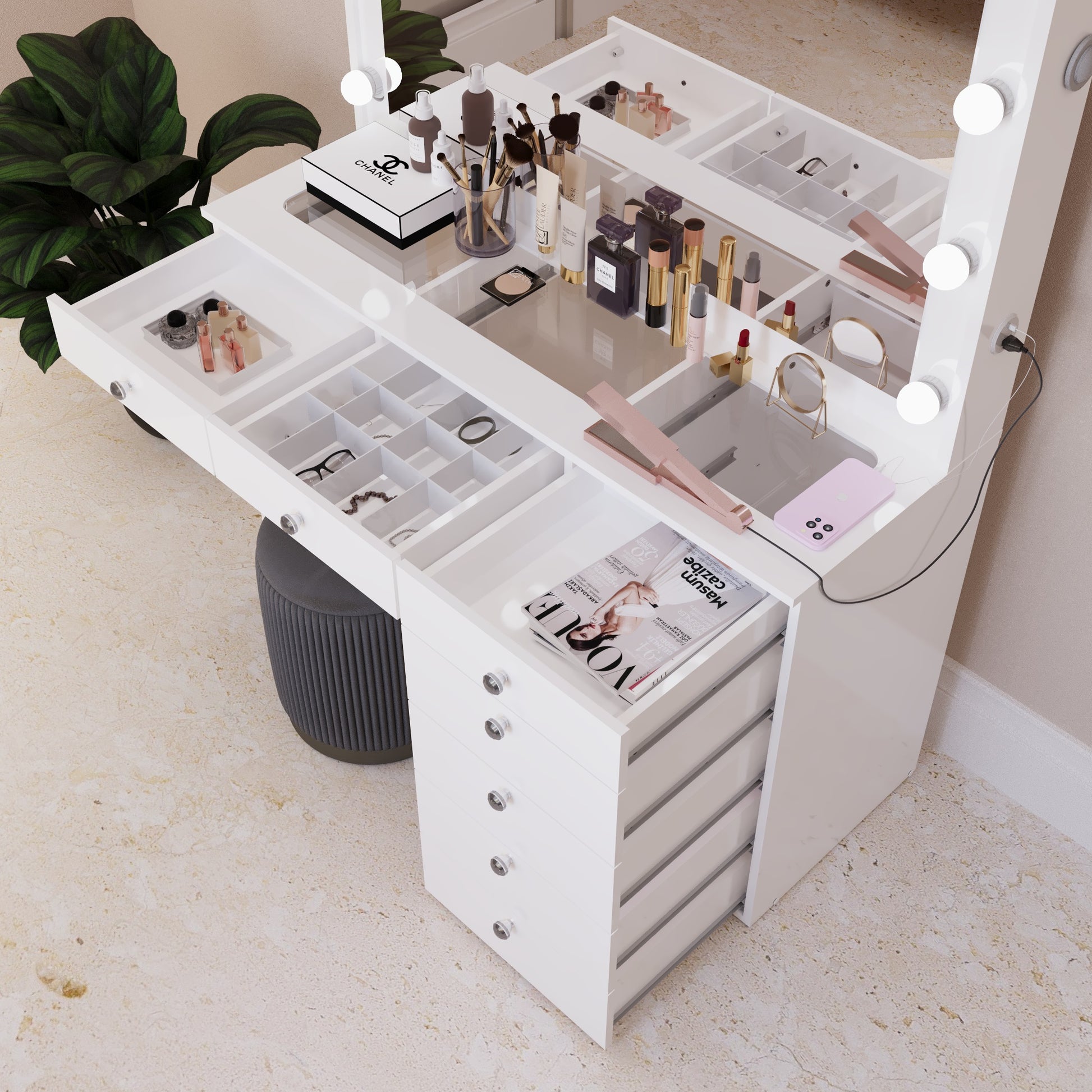2. Premium Surface & Organization: Glass Top and 7 Drawers β¨ Luxury meets durability. The tempered glass top not only provides a modern, elevated style but also protects the surface and allows you to view your essentials, making cleaning effortless. Beneath it, seven spacious drawers offer a sanctuary for your collection. It includes an integrated jewelry divider to protect your most precious pieces. Keep your brushes, palettes, and products perfectly organized in this vanity with storage and glass cover.