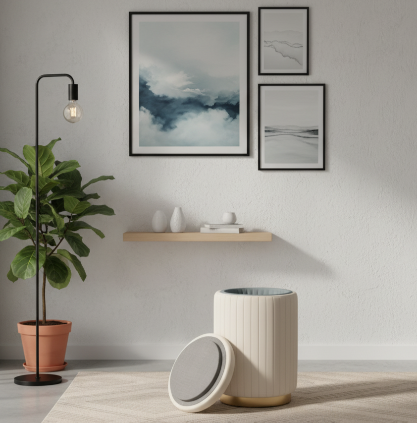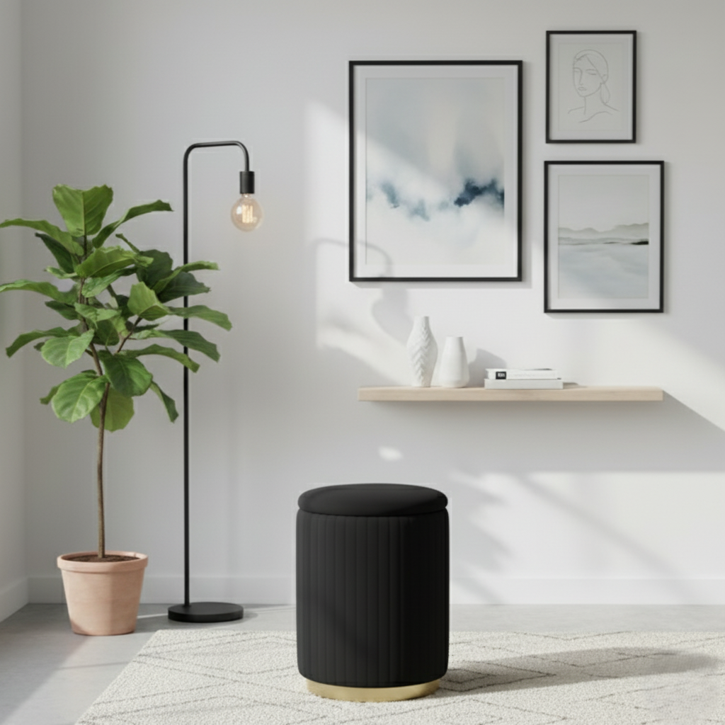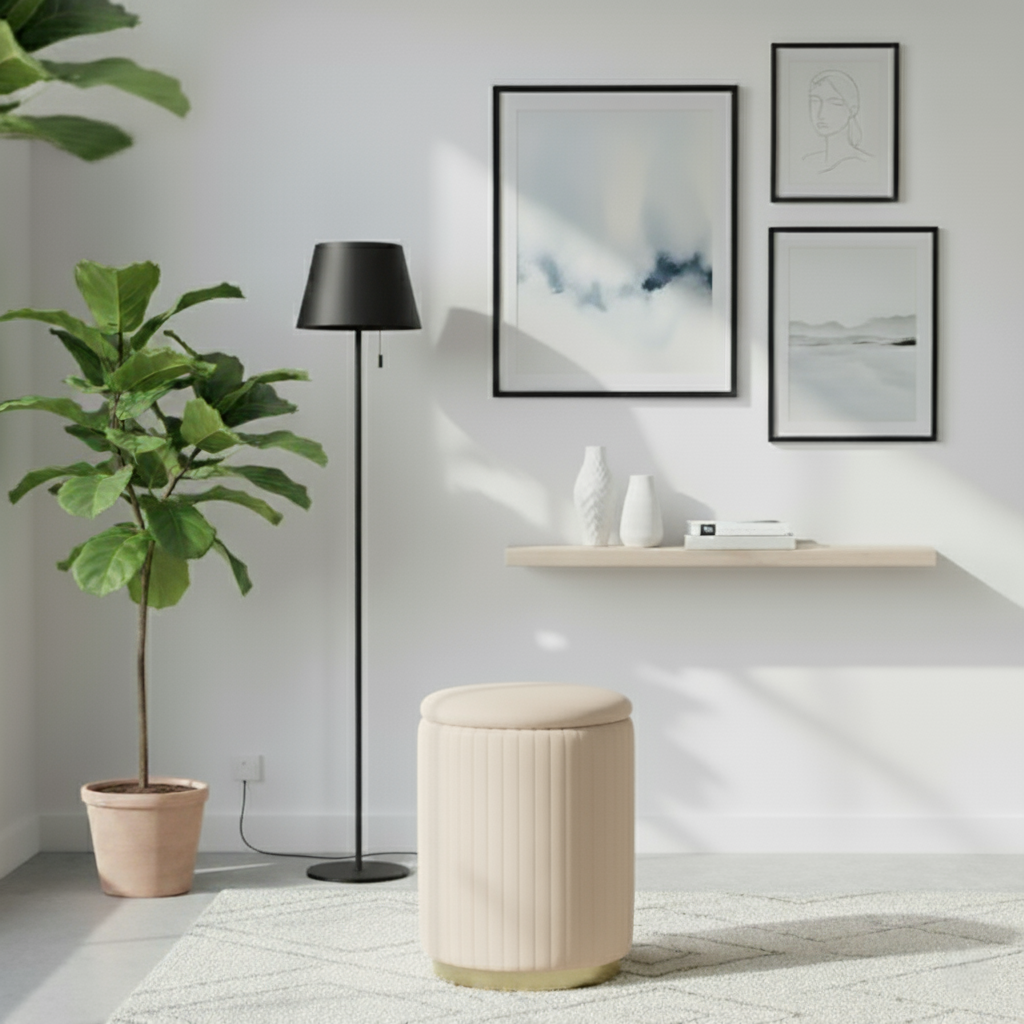 2. Smart and Discreet Storage 🧺 Keep things tidy effortlessly. The top lid of the stool lifts off, revealing a hidden storage compartment. Perfect for tucking away small blankets, magazines, remote controls, or vanity accessories. It is the ideal solution for small-space storage, combining the aesthetic of an ottoman stool with the functionality of an organizing box.